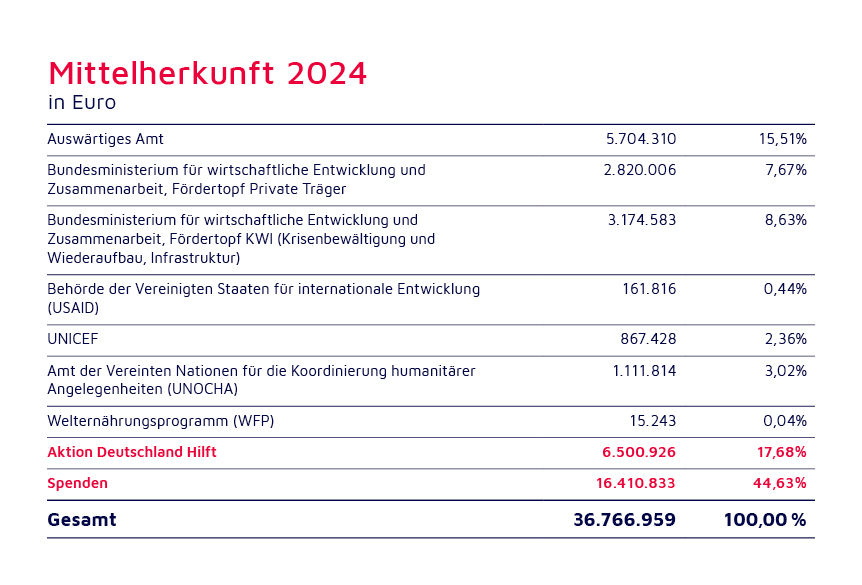Von besonderer Bedeutung sind für uns institutionelle Zuwendungsgeber. Das Bundesministerium für wirtschaftliche Zusammenarbeit und Entwicklung (BMZ) oder das Auswärtige Amt sind seit Jahren verlässliche Partner. Gemeinsam leisten wir als Träger mit lokalen Partnerorganisationen einen Beitrag, um global vereinbarte Entwicklungsziele umzusetzen oder humanitäre Hilfe in Krisen- und Katastrophenregionen zu leisten. Darüber hinaus ist das Europäische Amt für humanitäre Hilfe (ECHO) eine wichtige finanzielle Stütze für unsere Projektaktivitäten. Auf Projektländerebene gewinnen länderspezifische Hilfsfonds der Vereinten Nationen immer mehr an Bedeutung, um dem lokalen Kontext entsprechend schnell und effizient helfen zu können.