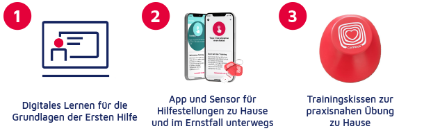 Mit dem bewährten e-Learning Kurs "Herzensretter Silber" lernen Sie nicht nur die theoretischen Grundlagen der Ersten Hilfe, sondern können das Gelernte auch direkt in der Praxis anwenden. Im Notfall wird der CorPatch®-Sensor auf dem Brustkorb eines Betroffenen angebracht. Im Zusammenspiel mit einer App auf dem Smartphone leitet CorPatch® Ersthelfende in allen Schritten an und gibt Feedback über die ausgeführte Herzdruckmassage. Ergänzt wird das Paket mit einem Handball-großen Trainingskissen („Cushion“), mit dem zuhause oder bei der Arbeit für den Notfall geübt werden kann.