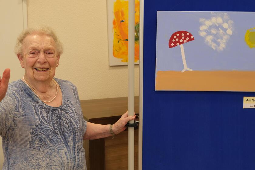 Senioren präsentieren ihre Kunstwerke bei Kanapees, Sekt und Klarinettenmusik der Öffentlichkeit.