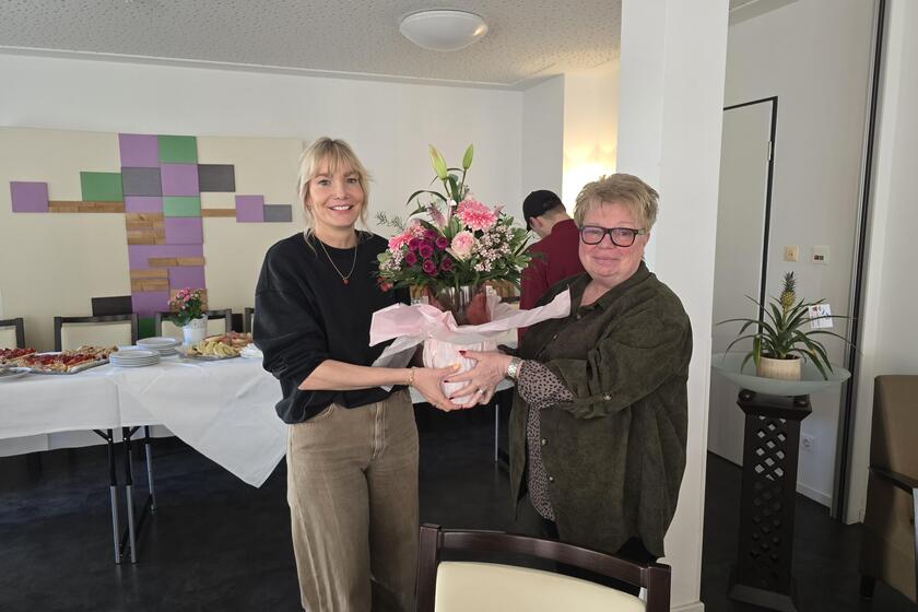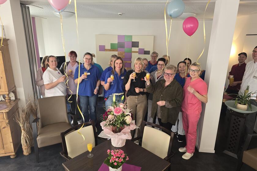 Zu diesem Anlass wurde sie von Einrichtungsleitung Celina Calmes mit herzlichen Glückwünschen, Luftballons und einem bunten Blumenstrauß überrascht. Gemeinsam mit ihren Kolleginnen und Kollegen wurde dieser besondere Moment im Restaurant bei einem gemütlichen Beisammensein mit belegten Brötchen, Kaffee und Kuchen gefeiert.