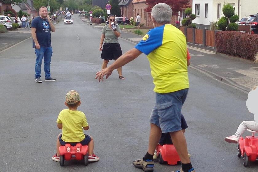 Da die Horsterstraße für das Radrennen abgesperrt war, hatten wir sogar eine ganz besondere Aufgabe: Unsere Kinder übernahmen die Rolle der Strecken-Security. Mit viel Begeisterung und auf ihren Bobbycars sorgten sie dafür, dass „alles sicher“ war und die Profis freie Bahn hatten.