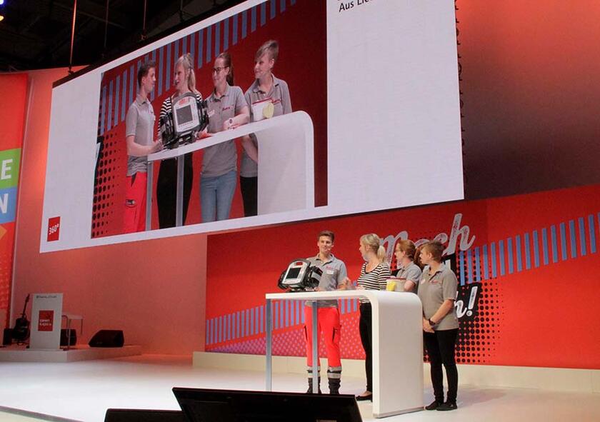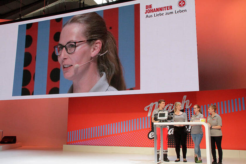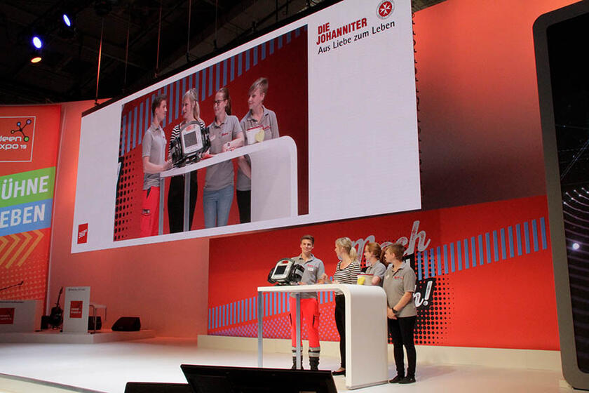 Mehr als 50 Johanniter sind bei der IdeenExpo in den Hallen und auf den Bühnen präsent und informieren über Karrierechancen, Einstiegsmöglichkeiten und Tätigkeitsfelder.