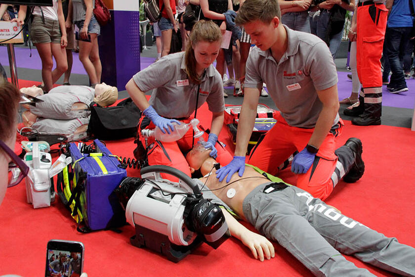 Wer die Notfallsanitäter in Aktion sehen wollte, erlebte dies im Anschluss am Stand. Zwei Sanitäter simulierten an einer Puppe eine Reanimation – vom Intubieren bis hin zur Herz-Lungen-Wiederbelebung. Der „Patient“ konnte dank der schnellen Hilfe aller Anwesenden gerettet werden. Bedeutenden Anteil hatten auch Schüler, die den entscheidenden - simulierten - Notruf abgesetzt hatten.