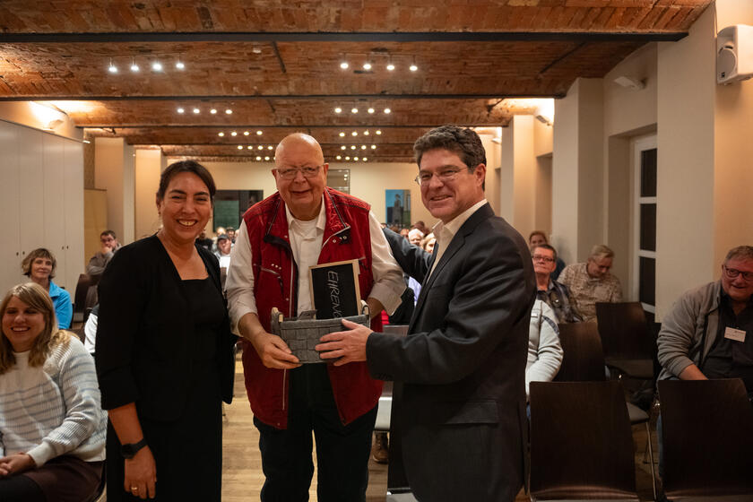 Mit persönlichen Worten des ehrenamtlichen Bundesvorstands Christian Meyer-Landrut, viel Applaus und stehenden Ovationen wurde Hans-Jürgen Schneider aus Bielefeld beim Ehrenamtsforum in Leipzig für seine langjährigen Verdienste für die Johanniter gewürdigt.