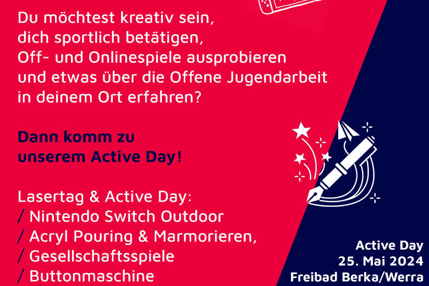 Bist du bereit für einen Tag voller Spaß und Action? Du interessierst dich für sportliche Aktivitäten, On- und Offline-Spiele und möchtest mehr über die Offene Jugendarbeit in deinem Ort erfahren? Dann ist unser Active Day genau das Richtige für dich!