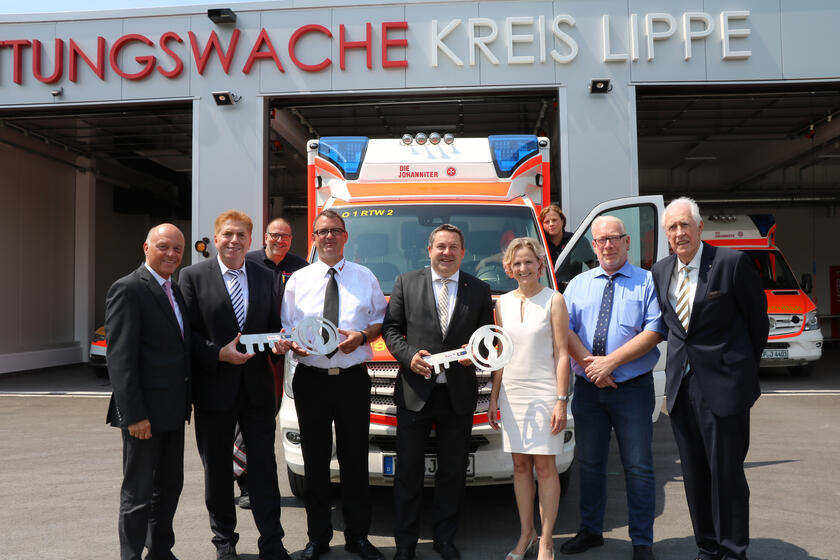 „Moderner, größer, komfortabler; so kann die neue Wache zusammengefasst werden“, lobt Landrat Dr. Axel Lehmann bei der Übergabe des symbolischen Schlüssels durch die Johanniter. Der Kreis Lippe hat die von den Johannitern erbaute Wache langfristig angemietet. Dass die neue Rettungswache mit ihren 900 m² rund 700 m² größer ist als die alte Unterbringung, habe aber nichts mit unnötigem Luxus zu tun, betont der Landrat. „Aufgrund der kontinuierlich steigenden Einsatzzahlen des Rettungsdienstes musste die Blomberger Wache sowohl mit mehr Personal als auch mit einem zusätzlichen Rettungswagen aufgestockt werden“, so Lehmann. Außerdem stellen die heutigen Hygiene-Vorschriften höhere Anforderungen, die in dem alten Gebäude nicht erfüllt werden konnten. Und noch ein weiterer Aspekte machte den Neubau nötig: Als vor fast 40 Jahren die alte Rettungswache erbaut wurde, hat noch niemand daran gedacht, dass 2018 rund 40 Prozent der Rettungsdienstmitarbeiter weiblich sein werden. Die neue Wache wird dem gerecht und verfügt nun über nach Geschlechtern getrennte Dusch- und Toilettenräume.