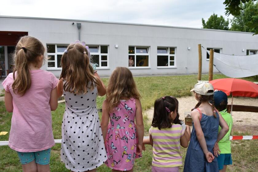 Dann muss sie kurz raus, aufs Außengelände. Die Kinder singen ein Geburtstagslied für eine Mitarbeiterin. Jede Gruppe steht dabei hinter einem Absperrband, dazwischen zwei Meter Platz. Die Mitarbeiterin steckt den Kopf zum Fenster hinaus und winkt fröhlich: ein Kita-Geburtstag in Zeiten der Corona-Pandemie.