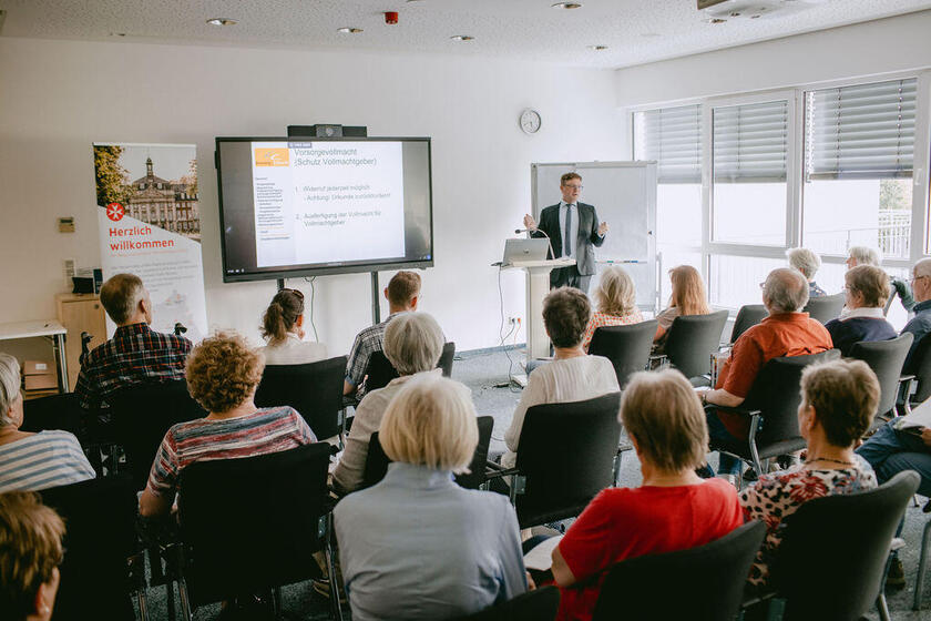 Als Referent konnten die Johanniter den Rechtsanwalt, Notar, Steuerberater und Fachanwalt für Erbrecht, Burkhard Boesing, gewinnen. Herr Boesing. Im Mittelpunkt des Vortrags standen die wichtigsten Aspekte von Vorsorgevollmachten und Patientenverfügungen. Herr Boesing erläuterte den Zuhörern, welche Vorkehrungen getroffen werden müssen, damit Angehörige im Ernstfall handlungsfähig sind und im Sinne der betreffenden Person handeln können. Dabei betonte er die Bedeutung einer frühzeitigen Planung und Kommunikation der eigenen Wünsche und Vorstellungen.