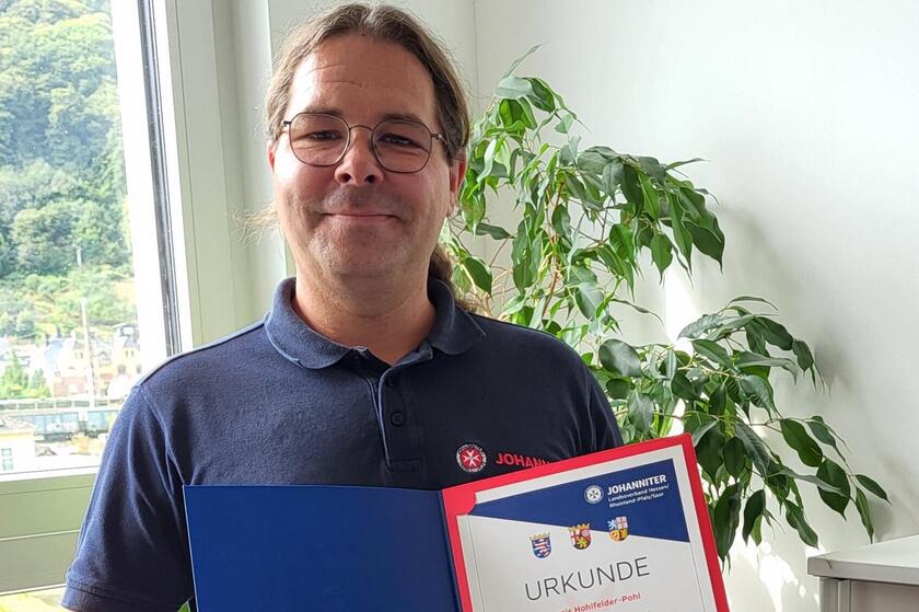 Wunderbar wandelbar könnte man es nennen, was das Johanniter-Sein seinen Mitarebietern ermöglicht zu sein. Unter den Trierer Johannitern brennen eine ganze Reihe Mitarbeiter seit vielen Jahren für ihren Arbeitgeber: Ein „Dauerbrenner“, die die gelebte Liebe zum Leben nicht missen möchten, ist Hausnotruf-Spezialist Dennis Hohlfelder-Pohl. Er ist jetzt für 15 Jahre Johanniter-Treue ausgezeichnet worden. Dabei hat er schon einige Rollen in der „Johanniter-Familie“ übernommen: „Es gibt hier so viel Freiheit mitzugestalten und lauter wirklich sinnvolle Tätigkeiten“, sagt der gelernte Rettungsassistent. Gestartet war der jetzt 46-Jährige aus der Elternzeit heraus in den Katastrophenschutz: „Als dann Strukturen für en Hausnotruf geschaffen werden sollten, konnte ich das mitgestalten und bin bis heute froh damit“. Seine Leidenschaft für „brenzlige Situationen“ lebt der freiwillige Feuerwehrmann nicht nur als Brandschutzbeauftragter sondern auch nebenher als Ausbilder für den Verband auch für Outdoor-Erste-Hilfe aus. Immer wenn es darum geht, die Dinge anzupacken, ist der Familienvater an vorderster Front dabei – ob in der Mitarbeitervertretung oder wenn es um praktische Hilfsprojekte wie die Weihnachtstrucker geht: „Wir können die Welt vielleicht nicht alleine retten, aber ganz sicher Impulse für das Gute setzen“, ist Dennis Hohlfelder-Pohl sich sicher.