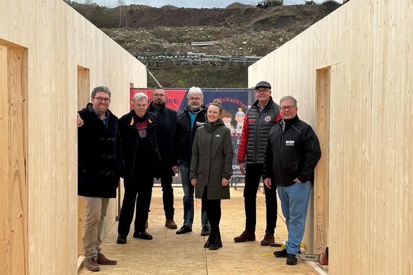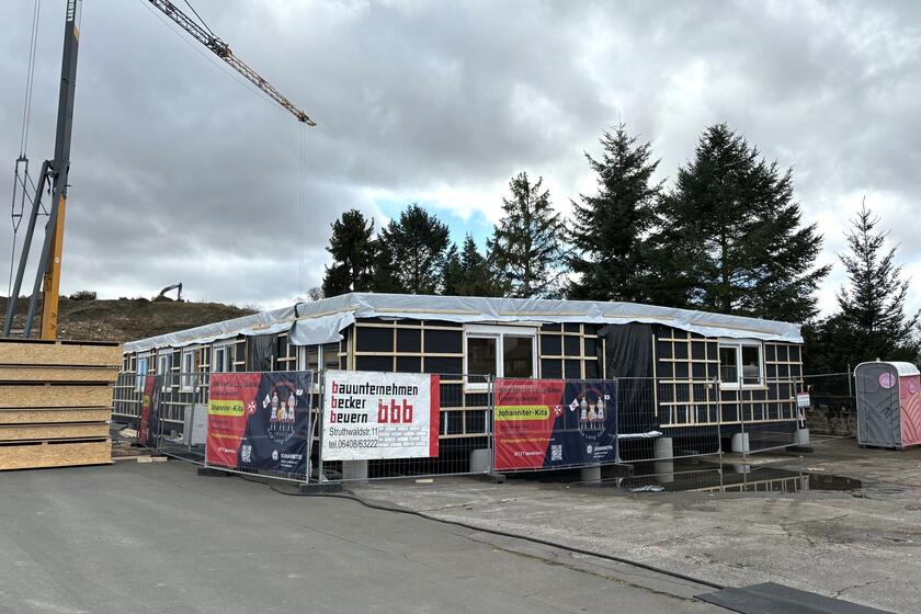 Vergangene Woche startete die Firma Becker planmäßig mit dem Aufbau der temporären Kita „Die Glücksritter“, die binnen kurzer Zeit auf dem Gelände von Tauben Lang in der Holzheimer Straße 75 in Lang-Göns in Holzmodul-Bauweise entstehen wird. Bereits am Freitag war der Aufbau der neuen Übergangskita, die von der Johanniter-Unfall-Hilfe e.V. (JUH) im Regionalverband Mittelhessen betrieben wird, soweit vorangeschritten, dass man sich zu einem gemeinsamen Besichtigungstermin vor Ort treffen konnte.