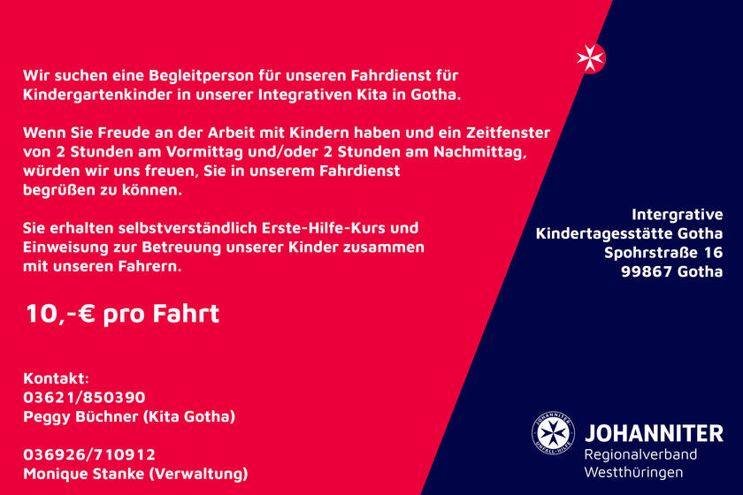 Wir suchen eine Begleitperson für unseren Fahrdienst für Kindergartenkinder in unserer Integrativen Kita in Gotha.