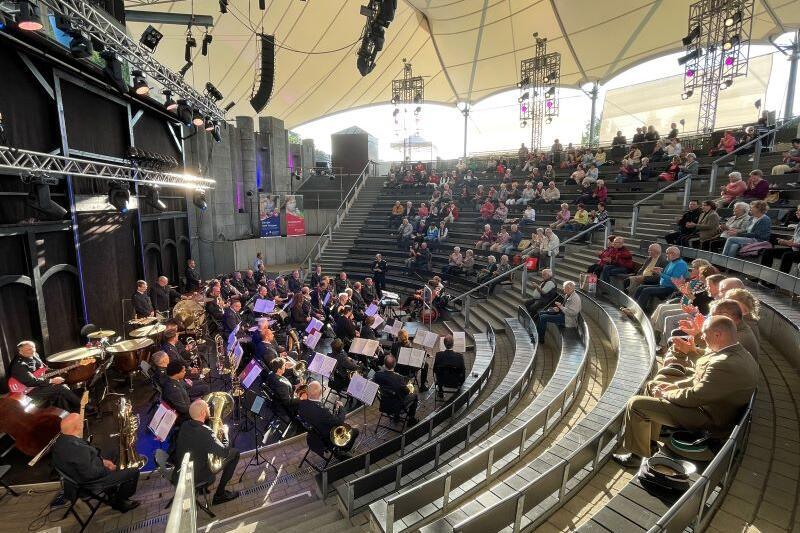 Blasorchester in Blau spielt im Amphitheater Senftenberg für kranke und trauernde Kinder und Jugendliche.