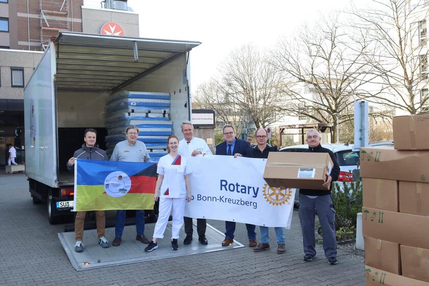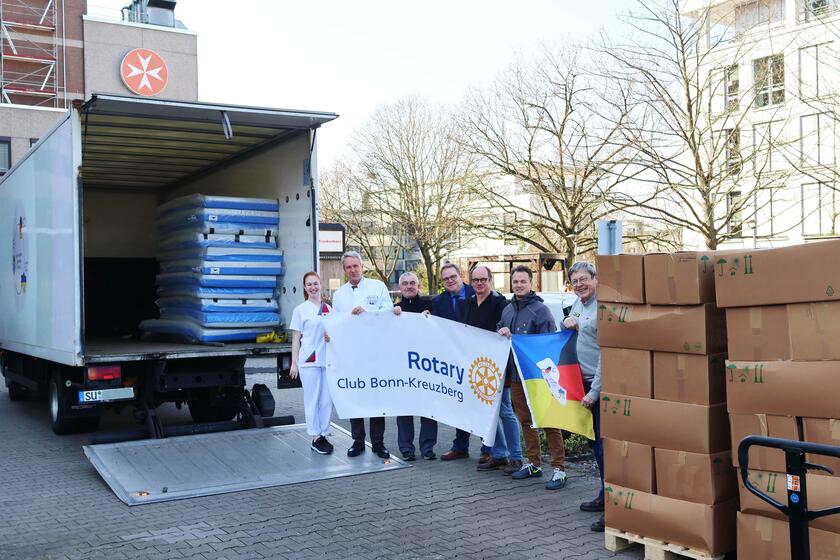 „Wir arbeiten schon seit langem erfolgreich mit dem Verein ‚Sankt Augustin and friends hilft‘ zusammen, der auch diesen Transport in die Ukraine organisiert. Umso mehr freuen wir uns, dass nun schon zum zweiten Mal eine so großzügige Spende durch das Johanniter-Krankenhaus Bonn zusammengestellt wurde“, erläutert Stephan Repges, Clubmeister im Rotary Club Bonn-Kreuzberg, bei der Übergabe der drei vollbeladenen Paletten durch Daniel Siepmann, Kaufmännischer Direktor des Johanniter- und Waldkrankenhauses Bonn.
