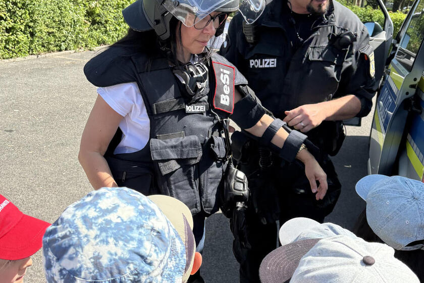 Und es blieb spannend: Die Kinder durften sich das Polizeifahrzeug genauer ansehen und erfuhren alles über die Ausrüstung der Beamtinnen und Beamten. Zum Beispiel die besondere Ausstattung des sogenannten Beweissicherungsteams BeSi, die Beatrice Starklauf vom Kita-Team direkt anprobieren durfte. Ganz schön schwer! Und ganz schön viel, was echte Polizisten so alles an ihrem Körper und an ihrem Gürtel tragen. Wer wollte, durfte dann auch selbst den Warnwestenmantel Probe tragen. Ein bisschen groß für die kleinen Hilfspolizisten, aber ziemlich schick!
