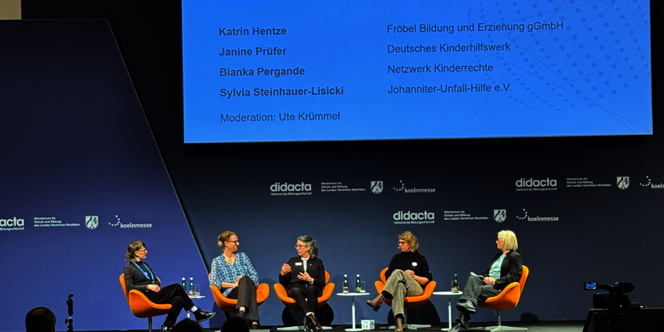Auch im Rahmenprogramm der Messe brachten die Johanniter Expertenwissen ein: Sylvia Steinhauer-Lisicki, Fachbereichsleiterin Kindertageseinrichtungen der Johanniter in NRW, bereicherte das Auftaktpodium um eine Johanniter-Stimme und diskutiert mit weiteren Gesprächsteilnehmenden zum Thema "Zwischen Anspruch und Wirklichkeit: Kinderrechte im Kita-Alltag leben".