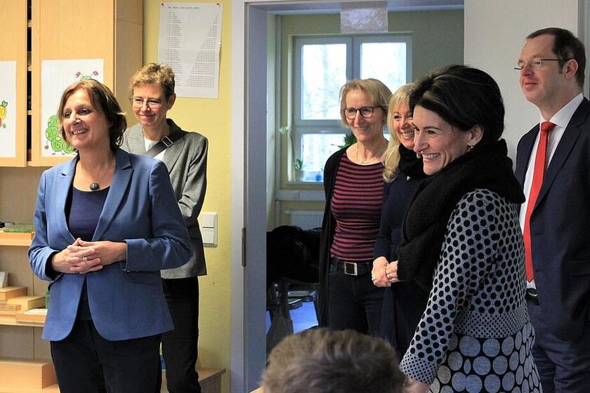 Heute Vormittag besuchte Brandenburgs Bildungsministerin Britta Ernst die Johanniter-Kinderakademie in Eberswalde. Schulleiterin Mandy Fischer und Kitaleiterin Marion Daht führten die Ministerin über den Campus.