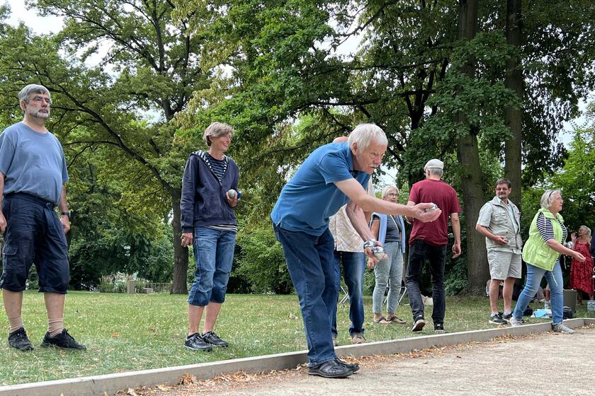 Der Sommer ist traditionell Ausflugszeit bei den Aktiven Senioren Bad Honnef. Wenn es das Wetter zulässt, trifft sich die Gruppe zum gemeinsamen Boule-Spiel. Diesmal ging es auf die Insel Grafenwerth in Bad Honnef. An einem Sommertag lud Leiterin Gabriele Knoth in den herrlich alten Park auf dem Rhein ein. Auf dem Bouleplatz, unter schattigen Bäumen, machten es sich alle gemütlich. Mit Blick auf den Rhein trafen sie sich dort auf ein Getränk und selbst gemachte Leckereien. Dann wurde die Boule-Ausrüstung verteilt. Man startete mit zwei Gruppen. Ziel war es, die eigenen Kugeln möglichst nah an die in Frankreich „Cochonnet“ genannte farbige Zielkugel zu werfen. Um das Spiel herum fanden fröhliche Gespräche und intensiver Austausch statt.