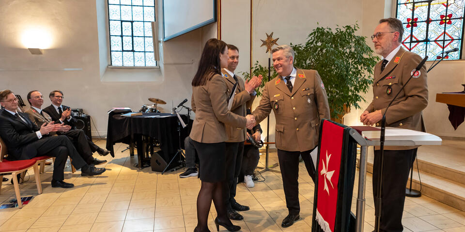 Bei der pandemiebedingt nachgeholten feierlichen Amtseinführung des Regionalvorstands der Johanniter in Südwestfalen kamen am Freitag zahlreiche Amts- und Würdenträger aus Politik und Gesellschaft, Johanniterorden und Johanniter-Unfall-Hilfe in der evangelischen Kirche Oberrahmede in Lüdenscheid zusammen. Die Überschrift der Veranstaltung, "Lasst uns Brücken bauen", war auch Richtschnur für den weiteren Austausch.