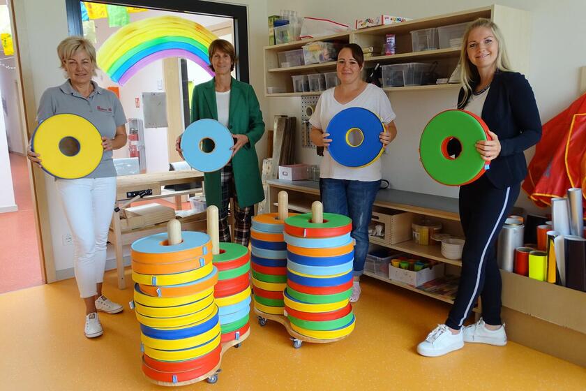 Die Schulzendorfer Kita "Ritterschlag" im Landkreis Dahme-Spreewald in Trägerschaft der Johanniter-Unfall-Hilfe e.V., hat am 1. Juni 2018 ihren Betrieb aufgenommen und bietet Platz für 70 Kinder. Schon lange wünschten sich die “kleinen Ritter“ in der Kita praktische Bodensitzkissen, die zugleich zum Spielen genutzt werden können. Dank der großzügigen Unterstützung durch die in Guben ansässige Dreißig Stiftung–Zukunft für Kinder war es jetzt möglich, mehr als 70 bunte Sitzkissen anzuschaffen. Die Wahl fiel nicht nur wegen des köstlichen Namens auf kunterbunte „Donuts“ zum Sitzen und Spielen. Durch praktische Stapelwagen lassen sich diese Sitzkissen auch gut verstauen und helfen den Jüngsten durch ihre farbenfrohe Gestaltung ganz nebenbei beim Erlernen der Farben. Die beiden Stiftungsvertreterinnen Claudia Thamke und Nadja Schiller statteten der Kita jetzt einen Besuch ab und ließen sich bei einem ausgiebigen Rundgang von der fröhlichen Stimmung in der Kita gerne anstecken. Ebenso gern beantworteten die JUH-Geschäftsstellenleiterin in Königs Wusterhausen, Daniela Freitag-Drewitz, die Kita-Leiterin Sabrina Ucher und Fachbereichsleiterin Angelika Poppe alle Fragen der Gäste und zeigten sich dankbar für die tolle Unterstützung.