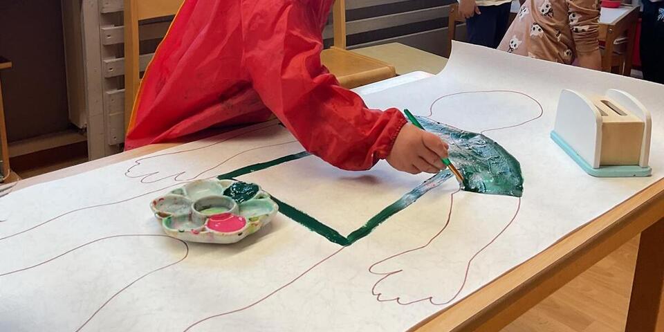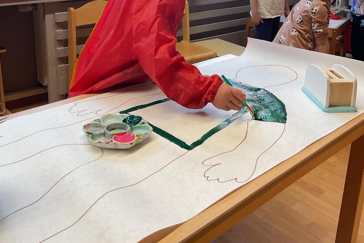 Unsere Strolche beschäftigten sich mit ihrem Körper. Wie groß bin ich? Was gibt es in unserem Körper und wie funktioniert alles? Sie entdeckten, erkundeten und verglichen. Auf einer Tapetenrolle umrandeten sie dann gegenseitig ihre Körper und malten diese mit Farbe aus. Nun schmücken große Kinderfotos unser Atelier.