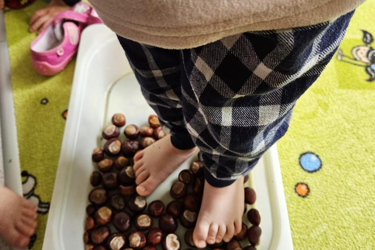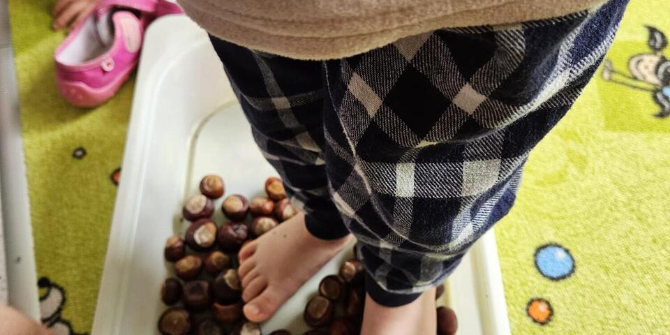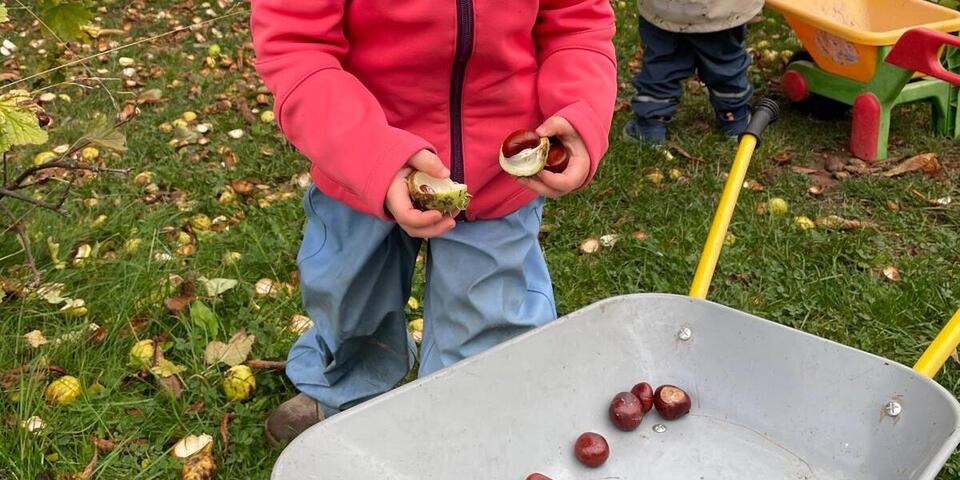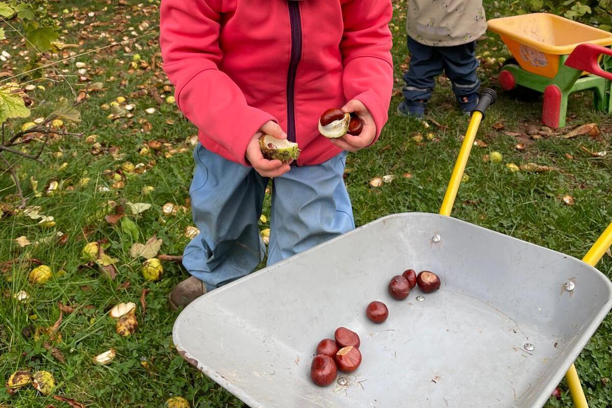 Nun weht und saust der Wind durch die Äste. Passend in diese Jahreszeit sammelten und sammeln die Kinder noch immer fleißig Kastanien für die Tiere im Wald. Einige Kastanien wurden auch zum Basteln und werkeln sowie als Fußmassage genutzt. Die vielen Blätter unserer großen Kastanie werden nun von den Kindern fleißig zu großen Blätterhäufen zusammengerecht und als weicher Sprungberg genutzt. So schön ist der Herbst.
