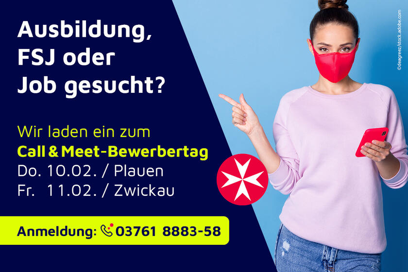 Am 10. und 11. Februar veranstalten die Johanniter erneut die „call & meet Bewerbertage“ in Zwickau und Plauen. Jeweils von von 13 bis 17 Uhr beraten die Johanniter am Donnerstag, 10.02. in Plauen, in der Neundorfer Str. 34 sowie am Freitag, 11.02. im ubineum Zwickau, Uhdestr. 25 zu Ausbildungsmöglichkeiten, FSJ und offenen Stellen.