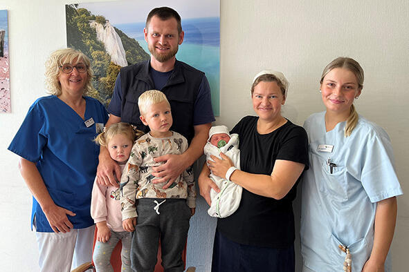 Der kleine Peter Gede (3.v.r.) fühlt sich bei seiner Mama Maria und seinem Papa Paul äußerst wohl und hat jede Menge Geschwister: Neben Leonid und Anna warten zuhause noch vier weitere auf ihn. Obwohl Leonid Peter sehr gerne direkt mit nach Hause genommen hätte, hat Mama Maria, die selbst gelernte Krankenschwester ist, entschieden, dass ihr ein paar Tage Ruhe bei uns in der Obhut des Pflegeteams (Elke Häger, links) und der Hebammen (Hebammenschülerin Nele Engelhardt r.) gut tun. Die Eltern danken dem Team um Chefarzt Oliver Fietz für die gute Begleitung - denn auch wenn es bereits ihre vierte Geburt in unserem Haus ist, verläuft jede anders. Wir wünschen Paul als 1000. und jedem anderen bei uns geborenen Kind Glück und Gottes Segen!