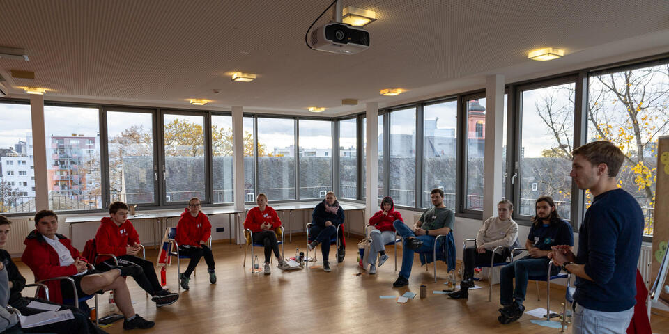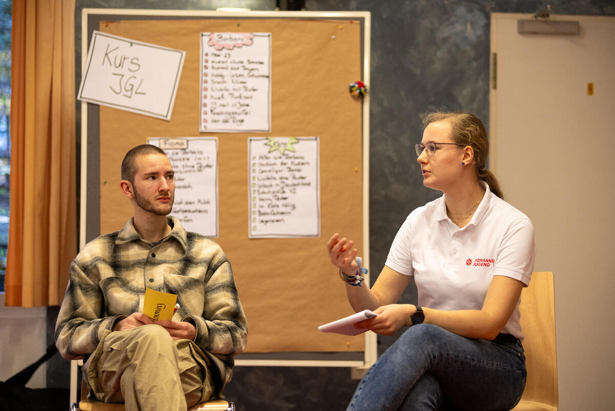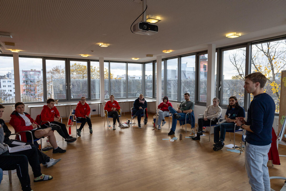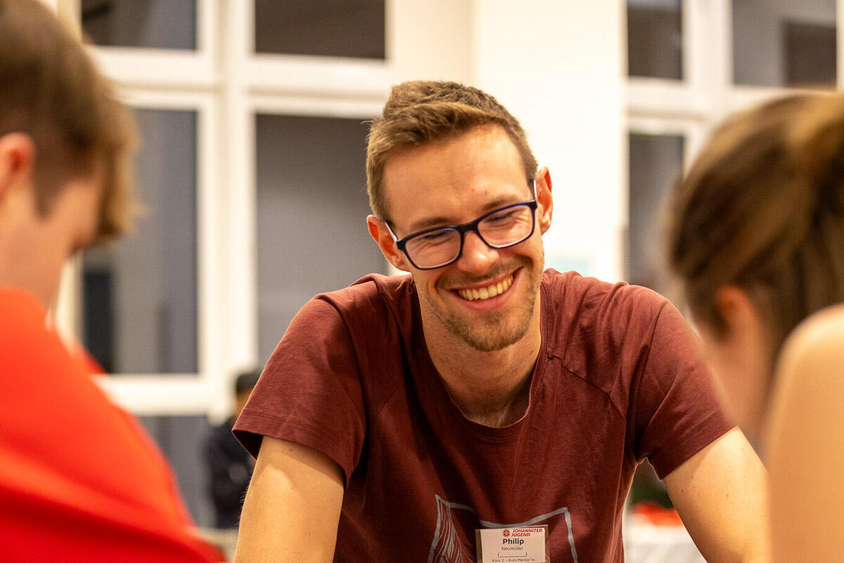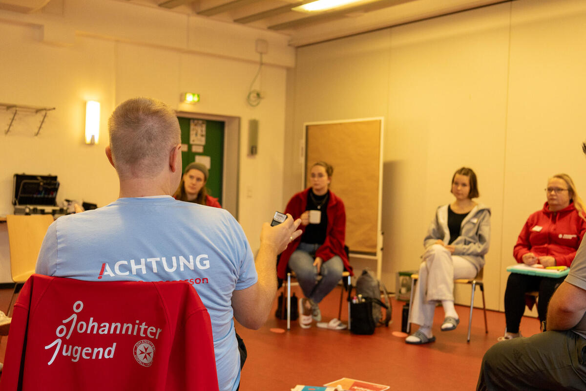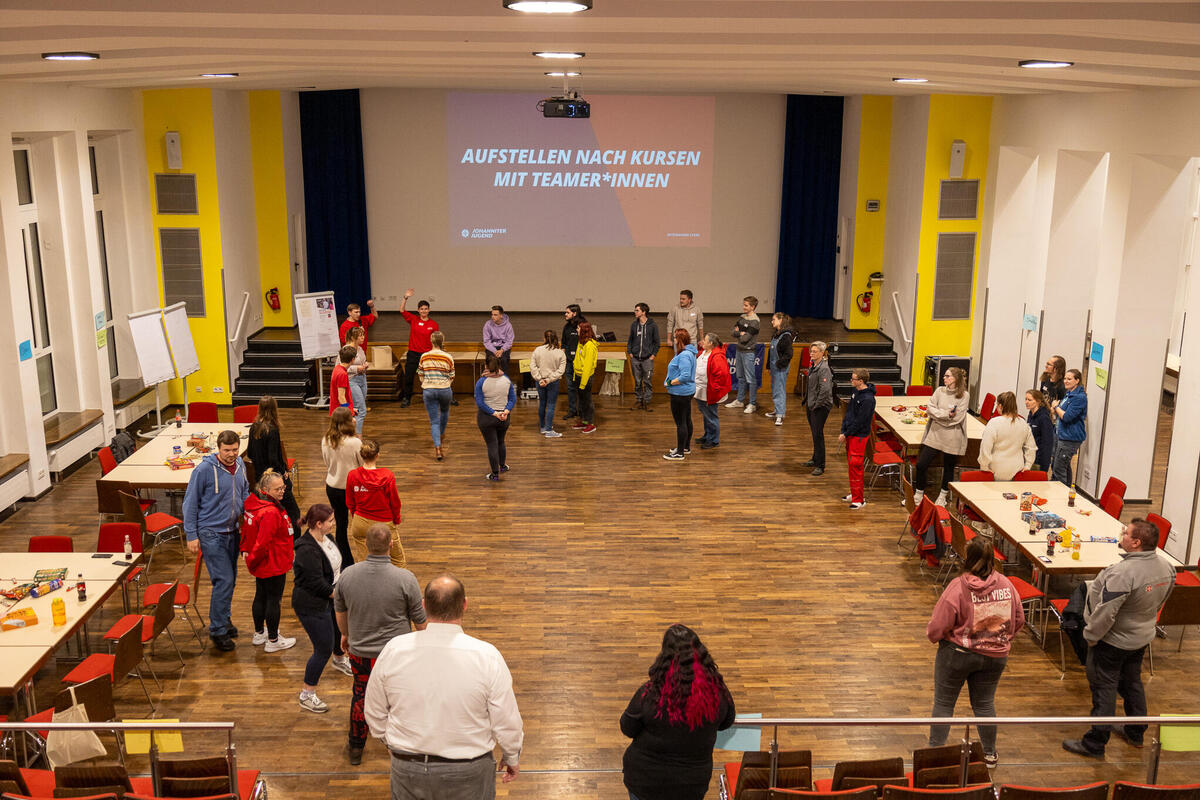 Zwischen den Einheiten war in den Pausen immer wieder Raum für Austausch zwischen den unterschiedlichen Kursen und Zeit sich mit Johanniter-Jugendlichen aus anderen Verbänden zu vernetzen. Am Samstagabend konnten die Teilnehmenden an unterschiedlichen Abendprogrammen teilnehmen. Für jede*n war etwas dabei: Eine Stadtführung mit einem ehemaligen Obdachlosen, sportliche Betätigung beim Kegeln oder Schwarzlicht-Minigolf oder ein entspannter Spieleabend in der Jugendherberge. Der Sonntagmorgen begann wie üblich mit einer Andacht. Cornelis und Markus stiegen ein mit "Die Mauern meiner Zeit", ein Lied von Reinhard Mey. Sie motivierten, dass es sich lohnt an der Veränderung und der Überwindung der heutigen Mauern mitzuwirken und die Hoffnung nicht zu verlieren. Auch wenn es oft schwer fällt, können wir gemeinsam Gutes schaffen. Nach der Andacht wurden die Kurse in den Kleingruppen fortgesetzt. Im Anschluss wurde noch gemeinsam Mittag gegessen bevor die Teilnehmenden ihre Heimreise antraten.