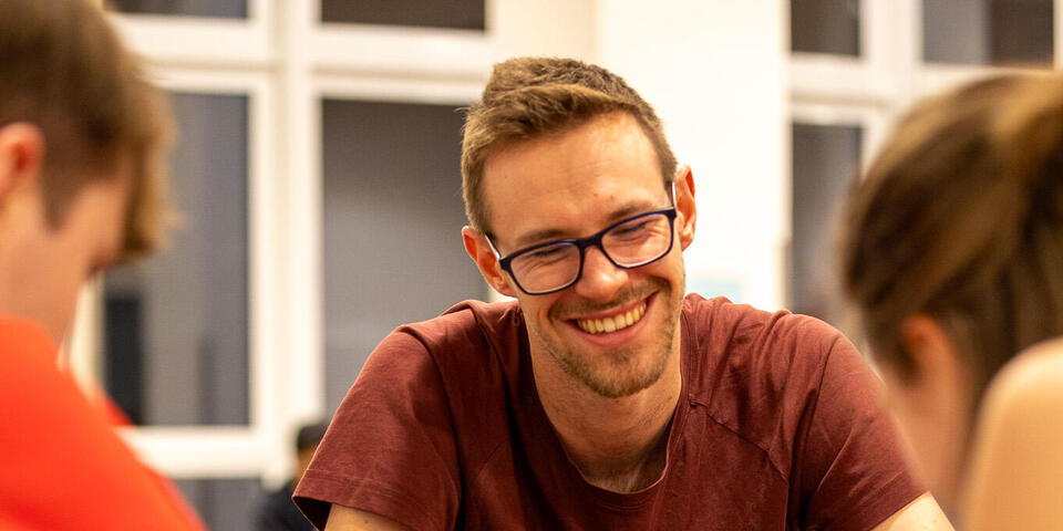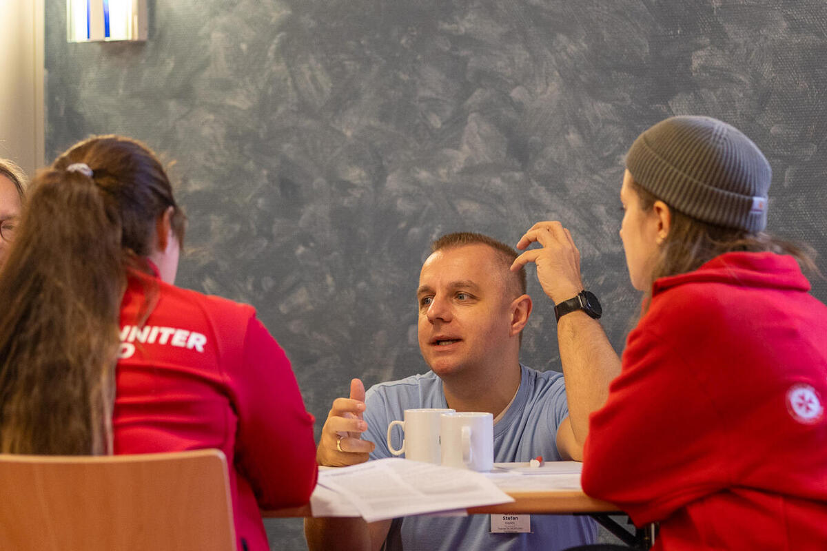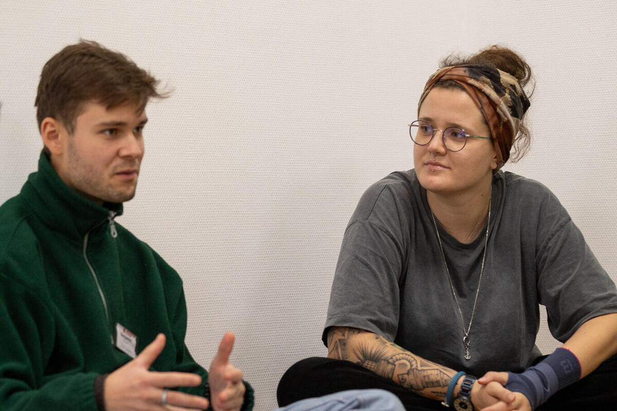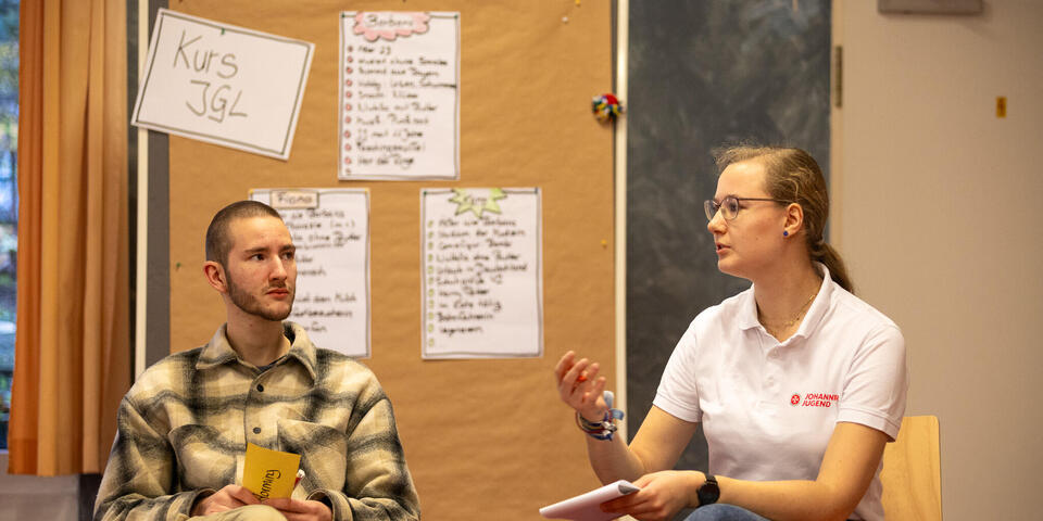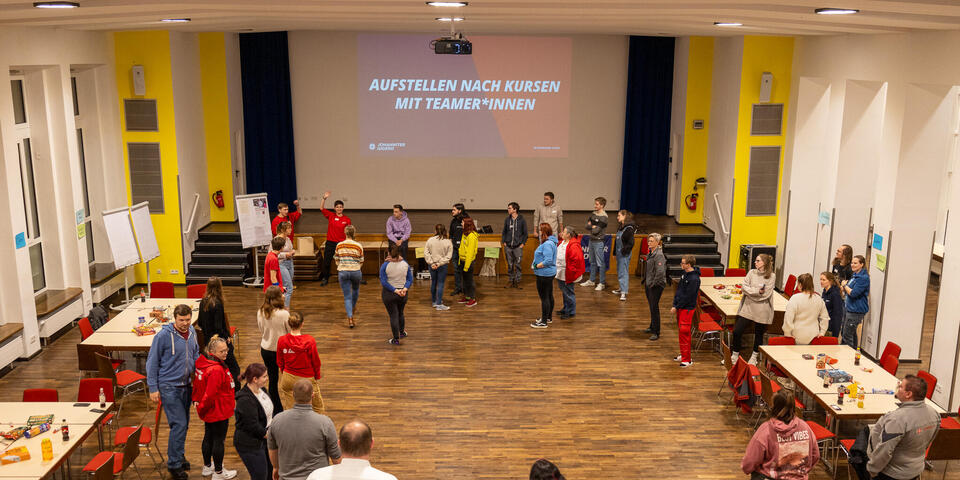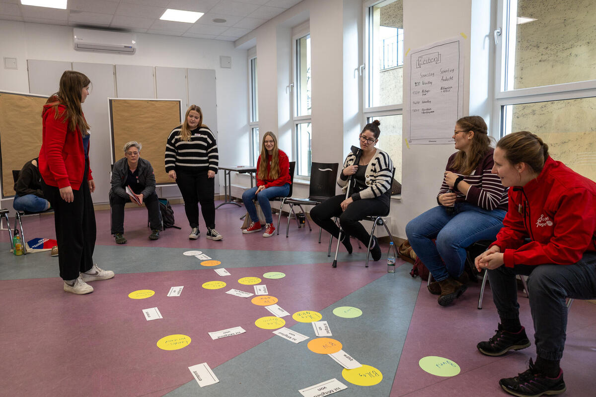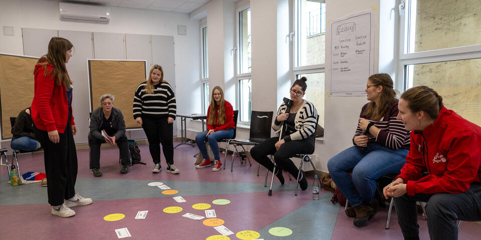 Zwischen den Einheiten war in den Pausen immer wieder Raum für Austausch zwischen den unterschiedlichen Kursen und Zeit sich mit Johanniter-Jugendlichen aus anderen Verbänden zu vernetzen. Am Samstagabend konnten die Teilnehmenden an unterschiedlichen Abendprogrammen teilnehmen. Für jede*n war etwas dabei: Eine Stadtführung mit einem ehemaligen Obdachlosen, sportliche Betätigung beim Kegeln oder Schwarzlicht-Minigolf oder ein entspannter Spieleabend in der Jugendherberge. Der Sonntagmorgen begann wie üblich mit einer Andacht. Cornelis und Markus stiegen ein mit "Die Mauern meiner Zeit", ein Lied von Reinhard Mey. Sie motivierten, dass es sich lohnt an der Veränderung und der Überwindung der heutigen Mauern mitzuwirken und die Hoffnung nicht zu verlieren. Auch wenn es oft schwer fällt, können wir gemeinsam Gutes schaffen. Nach der Andacht wurden die Kurse in den Kleingruppen fortgesetzt. Im Anschluss wurde noch gemeinsam Mittag gegessen bevor die Teilnehmenden ihre Heimreise antraten.
