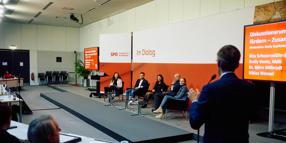 Was sind Herausforderungen in der Demokratie? Wie kann man junge Menschen fördern? Wie kann man demokratiefeindlichen Menschen entgegentreten? All dies waren Fragen, die unter Moderation von Shelly Kupferberg diskutiert wurden. Auf dem Podium: Rita Schwarzelühr-Sutter (MdB, Parlamentarische Staatssekretärin bei der Bundesministerin des Innern und für Heimat), Emily Vontz (jüngste Abgeordnete im Deutschen Bundestag und Vorsitzende der Jusos Saar), Dr. Björn Milbradt (Fachgruppenleiter „Politische Sozialisation und Demokratieförderung“, Deutsches Jugendinstitut e.V.) und Niklas Wenzel (Student und unter @otto.wels Influencer auf Instagram). Auch die anwesenden Gäste hatten die Möglichkeit zum Thema "Demokratie fördern – Zusammenhalt stärken" mit in die Diskussion einzusteigen.