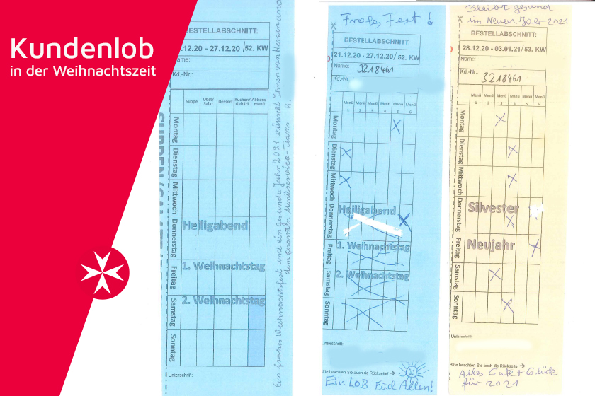 So wie diese hier: In einer Woche haben wir 1.500 Speisepläne an unsere Kunden verteilt. Und in diesen Zeiten gehen 650 Essen am Tag raus, damit auch niemand unversorgt bleibt. Da freut es den Menüservice sehr, auch mal ein verstecktes Lob auf den Bestellzettel vorzufinden.