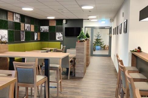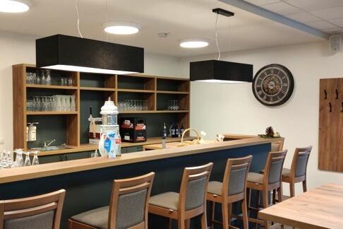 Im Neubau spielt vor allem die integrierte Gastronomie im Erdgeschoss eine zentrale Rolle. So ließ man in modernem Gewand ein Stück weit das wieder auferstehen, was manche ältere Ortsansässige noch kennen: Die Kneipe „Holzkistle“ mit zünftiger Theke und Bierzapfanlage, die hier zu Zeiten bestand, als das heutige Johanniter-Haus noch ein Hotelbetrieb gewesen ist. Es geht darum, viele Möglichkeiten zu eröffnen, ohne jemandem etwas aufzuzwingen. So wird nun organisatorisch der Service vom Pflegebereich beim Personal abgetrennt. Entstehen soll mehr Individualität für die Bewohnerinnen und Bewohner – es soll ein Lebensgefühl ähnlich einem Hotel erhalten bleiben, aber auch gewohntes, heimisches Ambiente, in dem man sich weitgehend selbst versorgt.