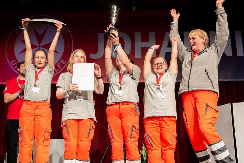 Zum ersten Mal im Starterfeld und gleich auf das Siegertreppchen schaffte es die H-Mannschaft, das Rettungshundeteam unseres Verbands. Staffelleiterin und Wettkampfteilnehmerin Heidi Stensel überraschte der Sieg: „Wir dachten, die erfahreneren Kollegen aus anderen Verbänden würden uns meilenweit voraus sein. Vor allem der Trageparcours war eine große Herausforderung für uns. Dass unser Team gewinnt, hätten wir nicht gedacht. Viele Johanniterinnen und Johanniter haben uns vor Ort den Rücken gestärkt – ein tolles Gefühl!“