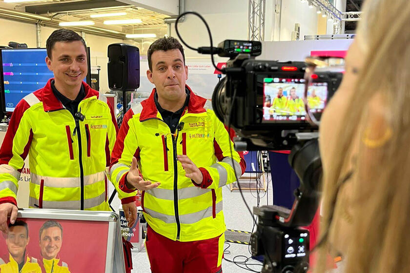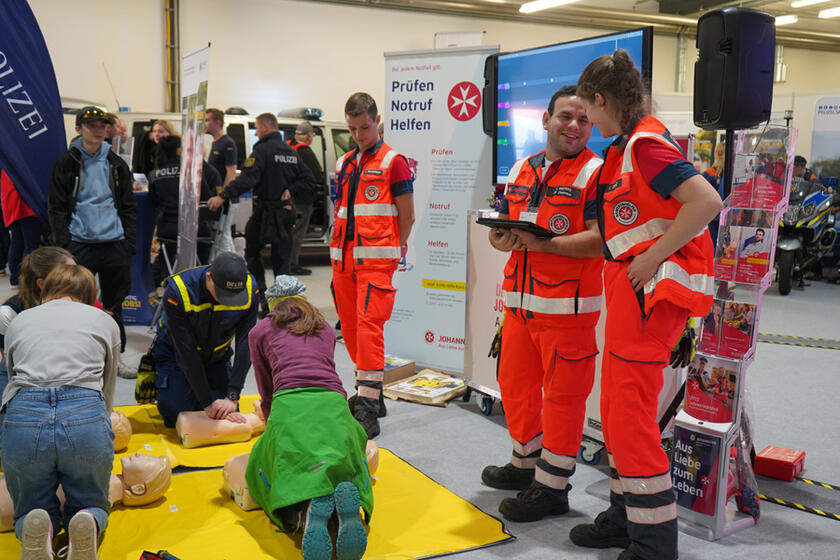 An unserem Messestand in Halle 3 durften wir auch wieder die Rettungsdienst-Influencer vom Podcast „RETTERVIEW“ Samy Splint (Christian Manshen) und notfalltaxi (Mike Rauch) begrüßen. Sie moderierten unser Reanimationsrace, führten mit den Messebesuchern Fallbeispiele durch und standen für Bilder und Gespräche bereit. Auch dieses Jahr hatten die Johanniter wieder einen Gemeinschaftsstand mit der sächsischen Polizei.