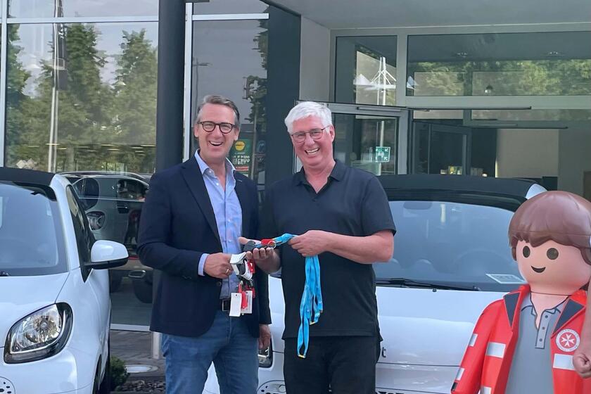 Als verantwortungsbewusste Organisation ist es uns ein Anliegen, auch hier unseren ökologischen Fußabdruck zu reduzieren. Mehr Elektrofahrzeuge in der Stadt bedeuten weniger Luft- und Geräuschemissionen und einhergehend auch mehr Komfort und Motivation für unsere Mitarbeitenden. Unsere Ambulante Pflege in Köln-Mülheim darf sich jetzt gleich über fünf neue Elektrofahrzeuge freuen. Bernd Kotthoff, Inhaber unseres langjährigen Partners, der Firma Bleses Kraftfahrzeuge GmbH & Co. KG in Köln-Deutz, übergab heute die Schlüssel für fünf nagelneue Smart EQ fortwo an unser Vorstandsmitglied Marius Mainzer.