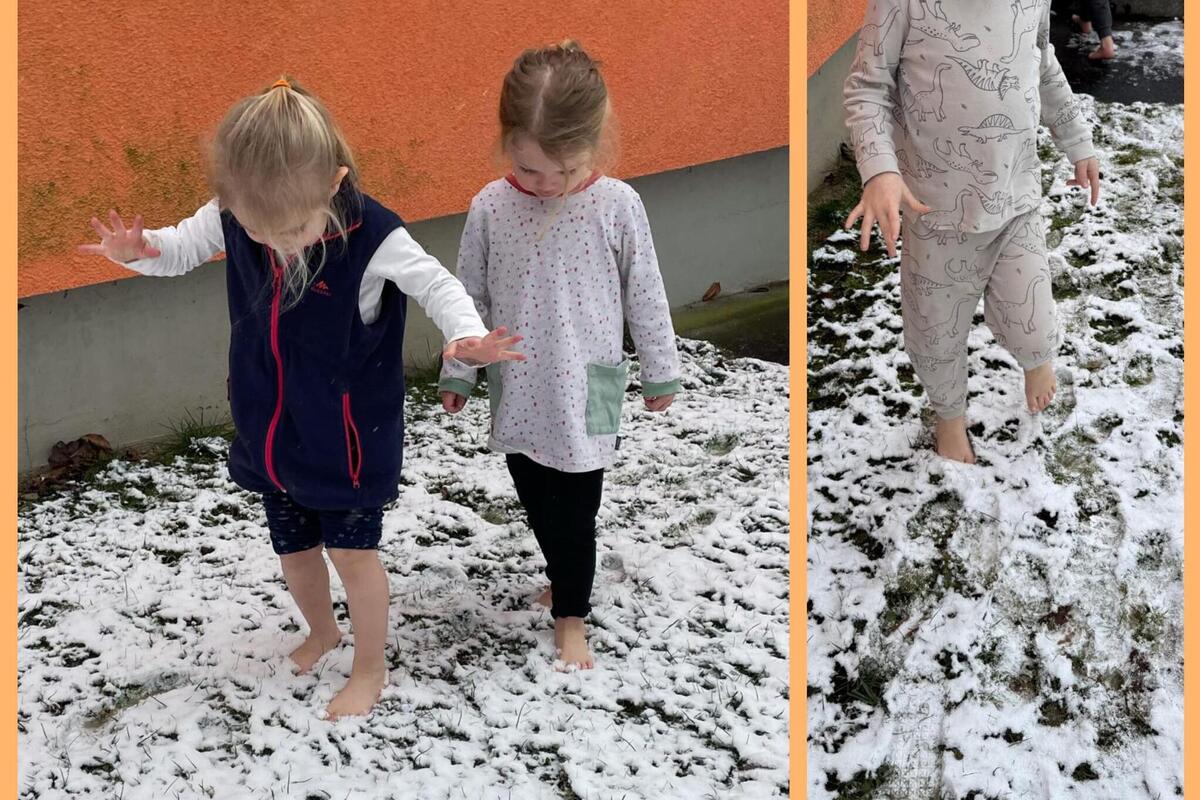 So stärken die Kinder gerade jetzt in der kalten Jahreszeit bei täglichen Wasseranwendungen ihr Immunsystem. Das regelmäßige Luftbaden und Tautreten sowie die Armbäder und -waschungen mögen die Kinder sehr. Sie berichten, wie die Haut kurz kalt wird und dann die Füße oder Arme ganz leicht kribbeln, um dann ganz warm zu werden. Ganz mutige Kinder waren in den kalten Tagen sogar draußen zum Schneetreten. Da kribbelt es noch etwas mehr und sie konnten sehr gut schlafen.
