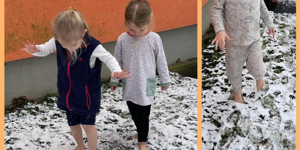 Im Garten konnten wir endlich den Winter erleben. Es war zwar nicht übermäßig viel Schnee, aber alle rodelten begeistert den Hang mit dem Rutschdeckel herunter. Sie konnten gar nicht genug bekommen. Sie bauten Minischneemänner und Schneeengel und genossen das Wintersonnenwetter.