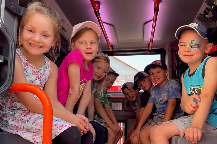 Dort angekommen, wurde man schon mit Pauken und Trompeten von allen anderen in Empfang genommen. Ein Foto als Erinnerung durfte nicht fehlen. Als Hausaufgabe fand man heraus, warum die Feuerwehrfahrzeuge über Funk alle „Florian“ heißen.