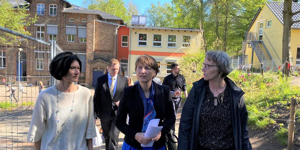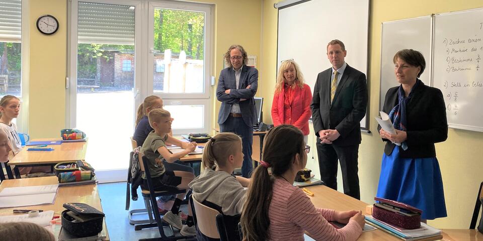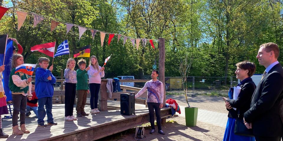 Die Botschafterin besichtigte die Einrichtung am Kupferhammerweg und freute sich anschließend sehr über die Vorführung der Schülerinnen und Schüler der Klasse 3b. Diese sangen zum Europatag eine ganz eigene Interpretation der Europa-Hymne vor.