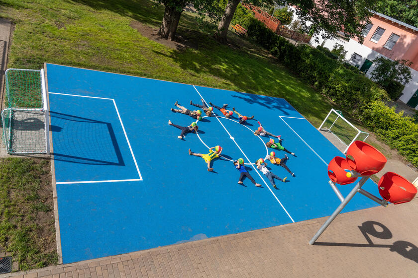 Übrigens lädt dieser Platz nicht nur zum Fußballspielen ein, sondern auch jegliche anderen Ballsportarten sind dort jetzt möglich. So können sich die Kinder auch im Basketball und Volleyball in den ersten Anfängen erproben. Wir sind alle sehr stolz auf unseren Platz und genießen die strahlenden Kinderaugen und den Ideenreichtum der Kinder im Umgang mit dem Ball nun jeden Tag!
