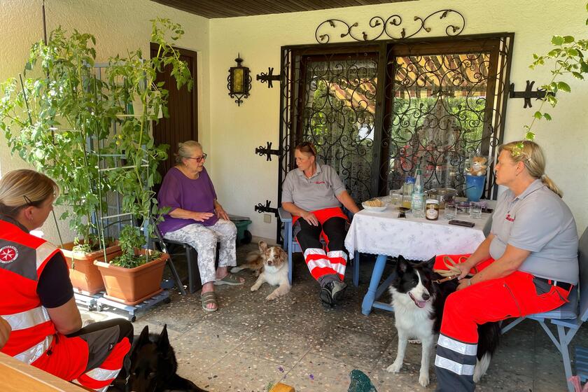 Ein Anruf bei dem Ortsverband Landsberg genügte und bald war ein Termin gefunden. An einem schönen Sommertag im Juli erzählten die ausgebildeten Hundeführerinnen von ihren Einsätzen. Sie schilderten ausführlich wie lange es braucht, um die Prüfungen zu bestehen und wie man die Rettungshunde immer wieder aufs Neue für die wichtige Arbeit als Flächensuchhund begeistern kann. Die Hunde lagen währenddessen im Schatten und genossen den „Hundstag“. Aus Liebe zum Leben war hier an diesem Julitag das Einsatzmotto. Die Gastgeberin war überglücklich und fühlte sich schon mitten im Sommer wie an Weihnachten. Das Bild mit den Hunden steht in ihrem Wohnzimmer zur Erinnerung an einen wunderschönen Tag. Sicherlich können wir nicht alle Menschen, die spenden möchten, besuchen. Aber manchmal führen Gottes Wege einfach Menschen, Tiere und das Gute zusammen.