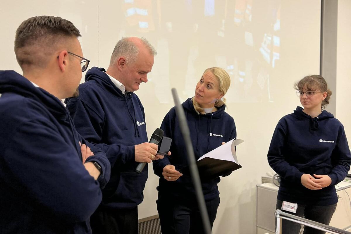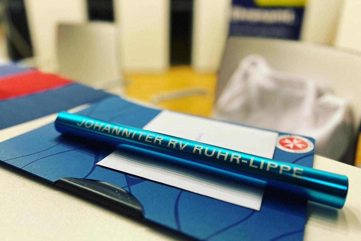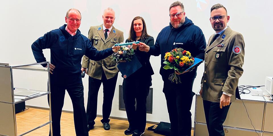 Benjamin Wobig (Regionalvorstand) und Karl von Strotha (ehrenamtlicher Regionalvorstand) übergaben zusammen mit Jörg Bombien dann den Staffelstab an André Paudtke und Gilda König als neue Standortleitung. "Gilda ist ein Herdecker Eigengewächs und ist mit 16 Jahren in den Ortsverband eingetreten. Sie hat sich immer stark gemacht im Sanitätsdienst, Rettungsdienst und Katastrophenschutz. Wovor ich aber wirklich den Hut ziehe ist, dass sie die Initiatorin des Ehrenamtsworkshops in Ruhr-Lippe ist, was das Miteinander des übergreifenden Ehrenamts verstärkt. Darüber hinaus ist sie Mitglied der landesweiten Arbeitsgruppe Ehrenamt und man kann sich immer auf deinen Einsatz verlassen", so Karl von Strotha.