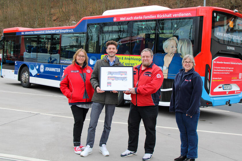 Wenn der Bus nicht auf den Straßen des Wartburgkreises unterwegs ist, parkt er auf dem Betriebsgelände vom Verkehrsunternehmen Wartburgmobil. Unter der Woche trafen sich die Hausnotrufmitarbeiter der Johanniter aus Westthüringen Claudia Ott, Marco Wesemann und Jeannette Ellenberg mit Fachbereichsleiter Hausnotruf und Vertrieb Marcel Hohberg sowie mit dem Regionalleiter Julian Pätzold von den SD VerkehrsMedien Thüringen GmbH zur feierlichen Übergabe.