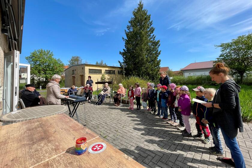 Das gemeinsame Musizieren, umrahmt von Klavierklängen, bereitete den Mädchen und Jungen aber auch den Gästen der Tagespflege große Freude. Unter Beachtung der derzeitigen Corona Bestimmungen besuchen die Kinder regelmäßig die Johanniter-Tagespflege Heldburg, um die Verbindung zwischen „Jung und Alt“ aufrecht zu erhalten und den Seniorinnen und Senioren eine kleine Freude zu bereiten. Für die Tagesgäste sind die Besuche der Kinder immer eine willkommene Abwechslung.