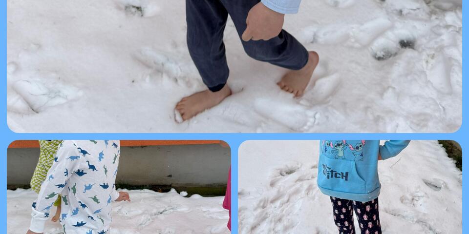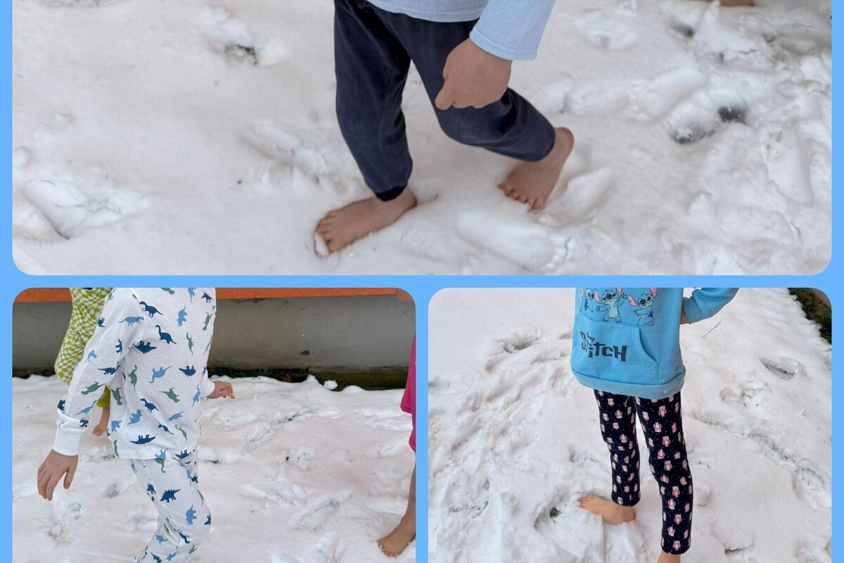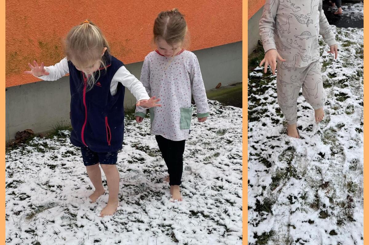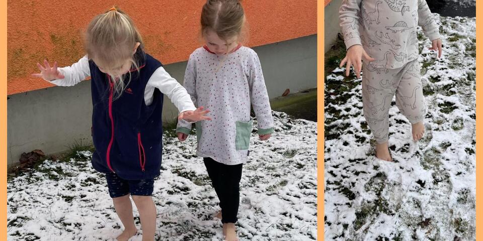 Sogar kneippen konnten wir teilweise im Schnee. So ging es vor dem Schlafen zum Schneetreten vor die Tür, damit die Kinder gut zur Ruhe kommen. Der Gesichtsguss im frischen Schnee auf den Hochbeeten war auch ein Highlight für die Kinder. Beim Einreiben der Arme gehörte schon Mut dazu. Aber die Kinder freuen sich jeden Tag auf ihre Wasseranwendungen nach Kneipp. Sie gehören schon fest in den Tagesablauf.