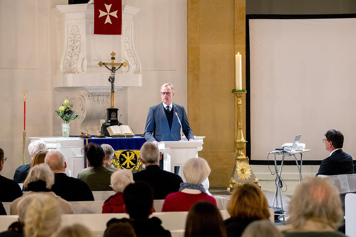 Einen scheinbaren Widerspruch löste der Regierende Kommandator der Hannoverschen Genossenschaft des Johanniterordens, Freiherr Dr. Wolfram von Fritsch, auf. Seine 14-jährige Tochter habe ihn gefragt, wo er denn heute hinfahre. Auf die Antwort, dass der Orden ein Frauen- und Kinderschutzhaus einweihe, habe die Jugendliche gefragt, was er dort wolle. Männer seien doch das Problem. Eine Sichtweise, die er durchaus nachvollziehen könne, auch wenn er sich hier umschaue. Viele Frauen darunter, die im beruflichen Alltag zu tun haben mit männlicher Gewalt und patriacharischer Struktur. „Und dann: ein Männerorden, mehr als 900 Jahre alt“, sagte Freiherr von Fritsch. Doch genau das zeichne die Johanniter aus: sich selber zurückzunehmen, wo sie Leid sehen, um Hilfe bieten zu können. Der schwarze Ordensmantel mit dem schlichten weißen Kreuz mache alle Mitglieder gleich. Das sei die DNA der Johanniter: Hilfe und Zuwendung, nicht herablassend, sondern auf Augenhöhe.