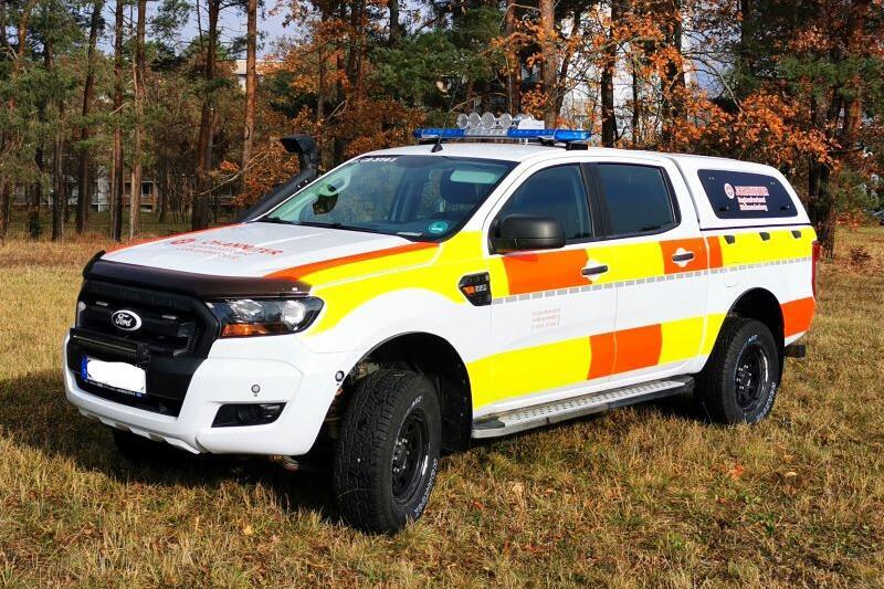 Der Ford Ranger 4x4 XL in schickem Frost-Weiß, markanter Einsatzaufmachung und mit 160 PS dient als Mehrzweckfahrzeug dem Katastrophenschutz. Die vorhandene Anhängerkupplung ermöglich den Transport der mobilen Sanitätsstation zu Einsatzorten.