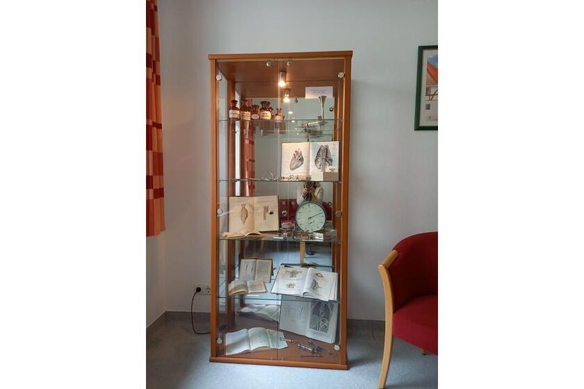 Die wunderschöne Vitrine schmückt jetzt den Warteraum vor der Intensivstation. Herr Dr. Bauch hat Material aus vielen Jahrzehnten Medizin zusammen getragen. Angefangen von historischer Literatur für den Medizinstudenten über erste Herzschrittmachermodelle bis zu einem “Feldbesteck”, das sein Vater im 2. Weltkrieg als Ausstattung hatte. In der Vitrine sind viele Schätze zu entdecken, wir freuen uns sehr über dieses großzügige Geschenk!