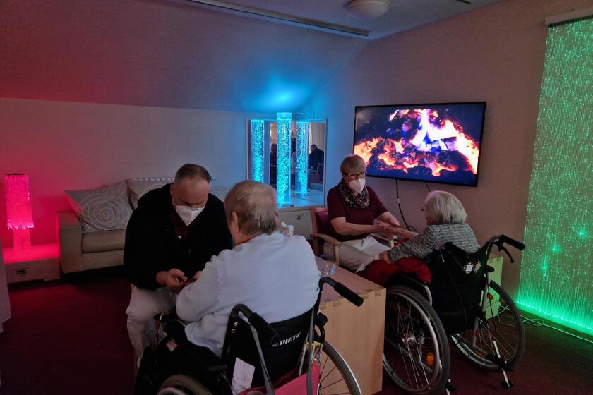 Das kann man besonders gut beim vierteljährlichen Wellnesstag. Erholung und Entspannung haben an diesem Tag oberste Priorität. Auf allen Wohnbereichen und im Snoezelen-Zentrum werden dazu verschiedene Annehmlichkeiten vorbereitet: Handbäder mit erfrischenden oder beruhigenden Düften, diverse Massagen, Fußbäder – alles kombiniert mit wohltuenden Klängen und wirkungsvollen Lichtquellen. Dabei hat jeder der Bewohner*innen ganz unterschiedliche Vorlieben. Während der eine sich bei einer Fußmassage zurücklehnen kann, findet der andere Entspannung bei einer Rückenmassage. Während der eine schweigend genießt, freut sich der andere über ein vertrautes Gespräch währenddessen. So individuell wie jede Person ist, so individuell ist auch die Art zu entspannen.
