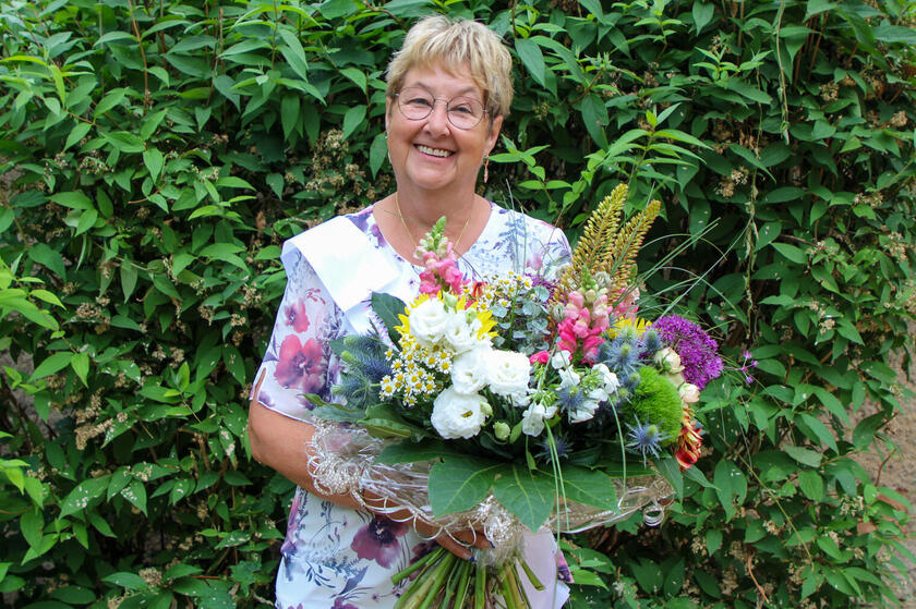 Frau Ehrhardt ist in Herbsleben eine bekannte Größe, engagiert in verschiedenen Vereinen, weshalb es auch Herr Mascher, als Bürgermeister von Herbsleben, sehr wichtig war, einen Blumengruß zu diesem Anlass zu überreichen.